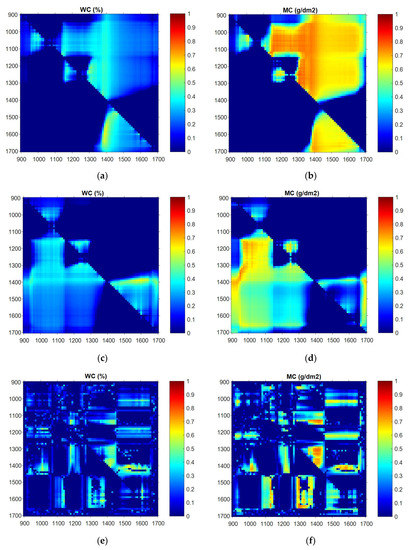 The maximum negative correlation coefficient between the raw relative reflectance and WC is observed at 1410 nm, where the coefficient value is . Regarding the relationship between the raw relative reflectance and MC, the maximum negative correlation coefficient is obtained at 1410 nm with the coefficient value of . The maximum positive correlation coefficient between the inverse-logarithm relative reflectance and WC is observed at 1420 nm with a low coefficient value of . With regard to the relationship between the inverse-logarithm relative reflectance and MC, the maximum positive correlation coefficient is obtained at 1420 nm, and the coefficient value is . For the relationship between the first derivative of relative reflectance and WC, the maximum positive correlation coefficient value is at 1430 nm. Moreover, the maximum negative correlation coefficient is obtained at 1140 nm with , and the second largest correlation coefficient value is obtained at 1430 nm with .