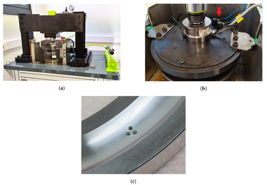 In this study, several thrust ball bearings in a test-rig oriented to reproduce rolling contact fatigue were used for experimental testing (Figure 1a). As this test-rig can operate at very low rotational speed condition (from 3 rpm) and high loads can be applied to the bearing [62], the configuration is in concordance to the conditions used in several and prominent publications found in the literature [33,63,64,65], and thus the configuration was appropriate for this study.