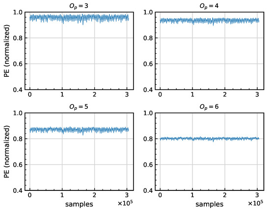 The selection of the value is performed with several PE signals computed using a process similar to that used for selection. The calculation uses , as covers less than samples. The results have the same waveform, but the amplitude reduces for higher values (Figure 3). Because a higher value requires more computational effort and amplitude has no influence on the SE, the signal is employed to reduce computing time.