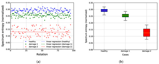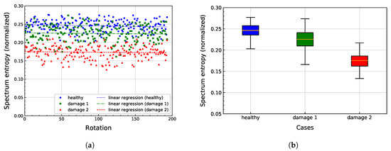Figure 5a shows the SE values for each rotation in HS, D1, and D2, along with their affine linear regression. The obtained results are in the band of 0.05 to 0.35, as the SE values are normalized. Figure 5a reveals a general pattern for each scenario, where the values for HS are on the top of the figure and the values for D2 are close to the bottom. The values for HS and D1 are significantly close in comparison to the values for D2, which are clearly separated to the aforementioned scenarios. In comparison to HS values, values for D1 and D2 are closer to 0, specially for the case with the bigger damage D2. The affine regresion for each data set can help to discern the difference among scenarios which are detected visually. From Table 1, the negative slope values reveal a very slow but steady decrease trend of the values through time. The y-intercept values expose the distance of each scenario trend to 0, where HS trend is the most distant and the D2 trend the closest one. For D1, the distance is slightly smaller in comparison to HS.
