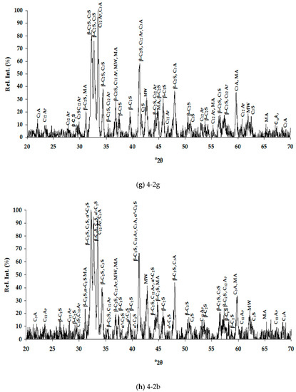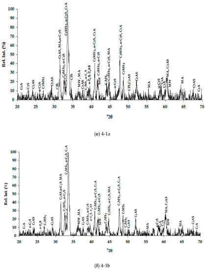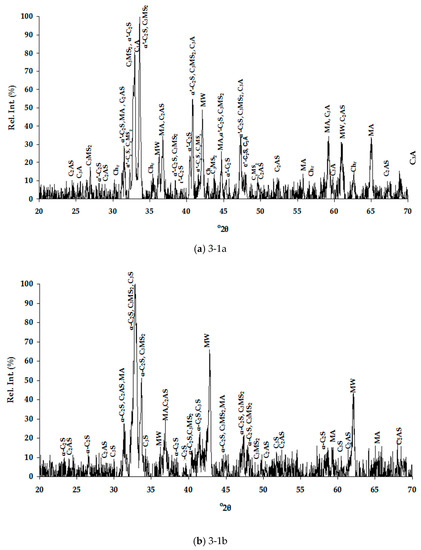 As illustrated in Figure 8, the means of cooling, given the way it was employed, did not result in significant differences upon the obtained strength results. The slightly higher long term values in case of water-cooled slags may be possibly correlated to some amorphous content, as well as the presence of more active C2S polymorphs [40]. Probably, cooling with high pressure water jets and formation of vitreous slags of these compositions could favor even higher strengths.