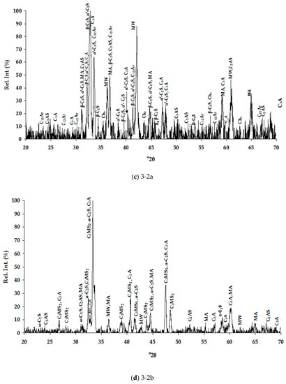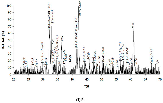 X-ray diffraction patterns of the studied slags: (a) slag 3-1a; (b) 3-1b; (c) 3-2a; (d) 3-2b; (e) 4-1a; (f) 4-1b; (g) 4-2a; (h) 4-2b; (i) 5a. Abbreviations—α′-C2S (α′-2CaOSiO2-Ca14Mg2(SiO4)8)—α′-dicalcium silicate-bredigite; α-C2S (α-2CaOSiO2)—a-dicalcium silicate; β-C2S (β-2CaOSiO2)—belite, β-dicalcium silicate; C3S (3CaOSiO2)—alite, tricalcium silicate; C3A (3CaOAl2O3)—tricalcium aluminate; C3MS2 (3CaOMgO2SiO2)—merwinite; MW (Mg1-xFexO)—magnesiowüstite; C2AS (2CaOAl2O3SiO2)—gehlenite; MA (MgOAl2O3)—spinel; Chr (FeOCr2O3)—chromite; CfS (CaOFeOSiO2)—kirschteinite; C12A7 (12CaO7Al2O3)—mayenite; C4AF (4CaOAl2O3Fe2O3)—brownmillerite; CF2 (CaO2Fe2O3)—calcium iron oxide.