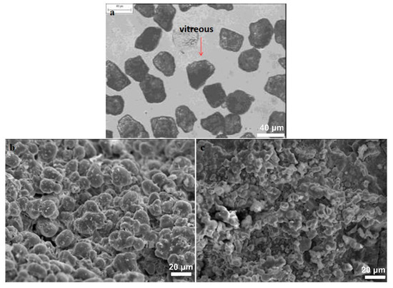 (a) Image of 35–45-μm fraction of water-cooled slag under polarized light; (b,c) SEM (SEI) micrographs of round-shaped C2S crystals development.