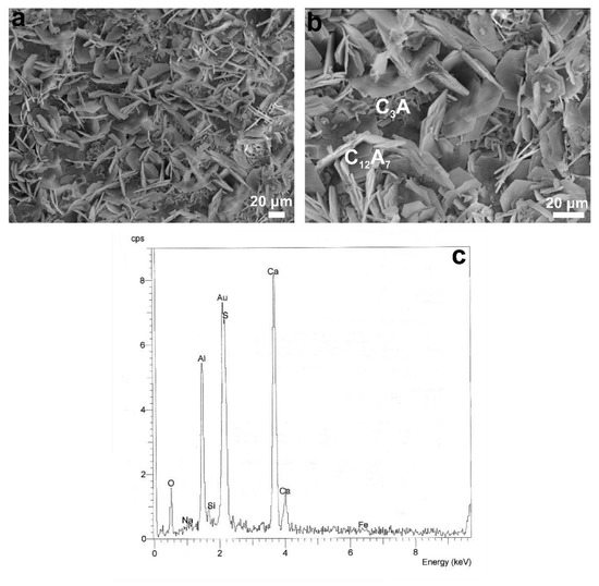 SEM (SEI) micrographs of calcium aluminates and hydrated calcium sulfo-aluminate phases in 4-2b slag (a) rich in calcium aluminates micro-area; (b) microstructure of calcium aluminate phases at higher magnification; (c) SEM/EDS spectrum of thin hexagonal plate (monosulfate).