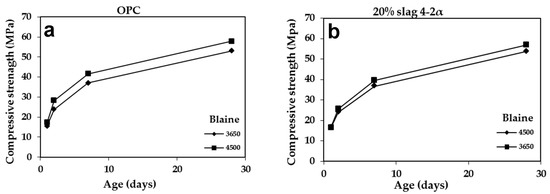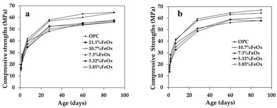Compressive strengths of CPCs (20% slag) manufactured with: (a) air-cooled slags; (b) water-cooled slags, Blaine: 4500 cm2/g.