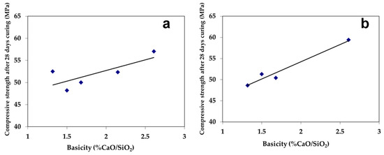 The beneficial effect of slag basicity on the 28-days of curing achieved compressive strengths of the CPCs for the air and water-cooled slags is presented in Figure 7. In general, the higher the slag basicity in the range of 0.9–2.7, the higher are the latent hydraulic properties of the slag expected to be, since slag’s basicity is directly related to the formation of the hydraulic calcium silicate phases [19,38,39]. Deviation from absolute linearity in the obtained results is related to the fact that strength development does not solely depend on calcium silicates, thus on the CaO/SiO2 ratio, but also on the other slag’s constituents, which are not at the same levels in the slags. In example, the concentration of alumina, which participates in the formation of cementitious phases, also has an effect.