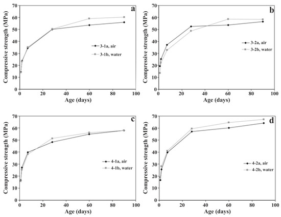 (a–d) Effect of cooling media on the development of compressive strengths in CPCs (20% slag) manufactured with air and water-cooled slags of the same chemical analysis.