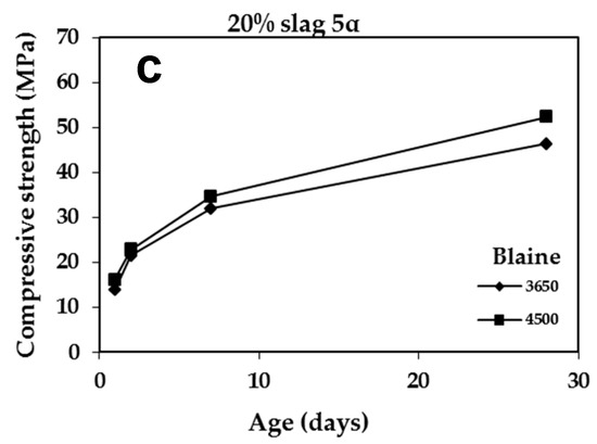 The early, late and long term compressive strengths development of the CPCs with 20wt.% slag are presented in Table 6 and Figure 6a,b for the air and water-cooled slags, respectively. In addition, the results are compared to the OPC (95% clinker and 5% gypsum). All investigated mixtures were found to be within the values of EN 197-1 [17]. The early strengths (2 days of curing) were found higher than 2 Pa and 28-day curing strengths were in the range of 48.2–59.4 MPa. The preservation of relatively high early strengths observed in all the composite cements despite their limited and/or no C3S content is most possibly attributed to the contained calcium aluminates.