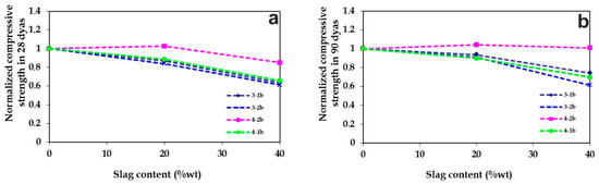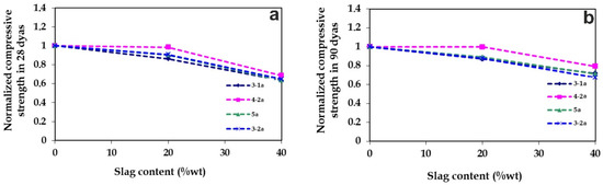 Normalized compressive strength of cements manufactured with air-cooled slags in relation to their slag content (a) after 28 days of curing and (b) after 90 days of curing.