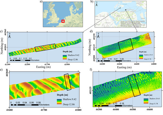 Study areas: (a) the North Sea and (b) southwest of The Netherlands showing the Oosterschelde estuary (Eastern Scheldt) and the location of the two datasets. Bathymetry maps of the surveyed area for (c) a 10 water depth with the grid cell size of × , (d) a 30 water depth with the grid cell size of 1 × 1 , (e) zoomed in on the black rectangle shown in (c), and (f), and zoomed in on the black rectangle shown in (d). The bathymetry maps correspond to the measurements with a pulse length of 54 . The black rectangles in (e,f) indicate the areas considered for the depth uncertainty calculation.