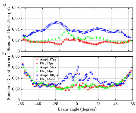 Standard deviation of the depth measurements for water depths of (a) 10 and (b) 30 , with a pulse length of 27 (red), 54 (green), and 134 (blue). The transition from the amplitude (Ampl) to phase (Ph) detection is shown by changing the square marker to an asterisk.