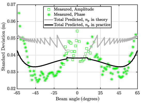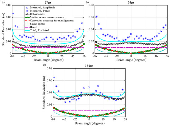 The first and third contributions are equal for both amplitude and phase detection. However, the expression for the second term differs. In the case of using amplitude detection, the contribution of the across-track angular measurements’ uncertainty to the depth uncertainty is a constant term equaling [6,7]. Comparing the measured and predicted uncertainties suggested that this term requires modification.