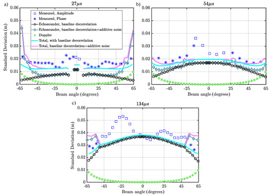 Shown in Figure 5 are the modeled and measured bathymetric uncertainties for the area indicated by the black dashed rectangle in Figure 1e for a water depth of 10 with a pulse length of 27 (a), 54 (b), and 134 (c). It should be noted that for the bottom detection method (amplitude or phase), the approach documented in the data was taken.