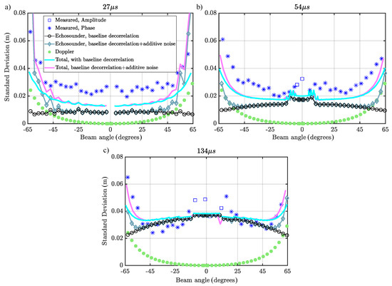 As for the deeper surveyed area and the two shorter pulse lengths in Figure 8a,b, although still an underestimation occurs for the inner and middle beam sector, the increase of the bathymetric uncertainties with increasing beam angle is now well predicted. As for the longest pulse length, a very good agreement between the modeled and measured depth uncertainties is obtained for all the beam angles, which was expected as the discrepancy observed between them discarding the contribution of the additive noise was mainly concerned with the most outer beams.