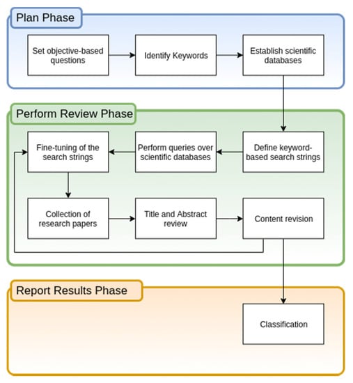 To perform the following review, a methodology for selecting and discarding papers was applied as described in our previous research work [1]. The methodology used is based on a semi cyclic process and combined with a systematic review. It is comprised of three phases: plan phase, perform review phase and report results phase. First of all, during the plan phase, search strings and digital research repositories were defined. In the perform review phase, search strings were adapted for every repository, preliminary results were collected, relevant information was extracted and candidate papers were selected. Finally, during the last phase, selected documents were fully reviewed. The methodology used is shown in Figure 1.