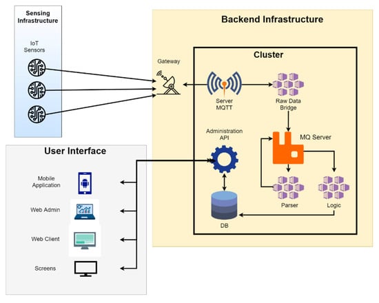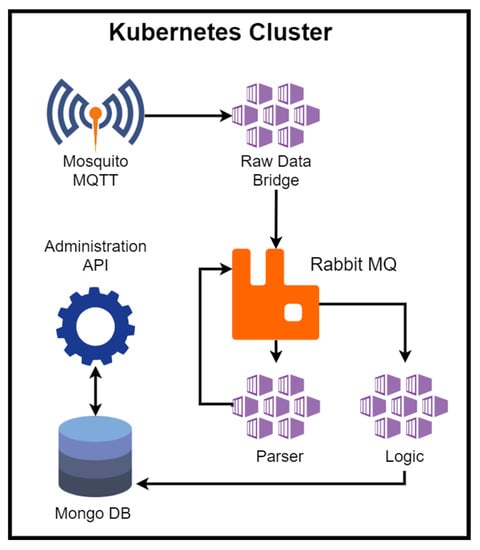 This part of the solution is in charge of processing the information collected by the sensors. The backend was mainly built over a cluster of Kubernetes. Kubernetes is an open-source system that allows to automate the deployment of applications based on containers. In this solution, Kubernetes have been used to deploy database server, message queue server, MQTT server and the REST API. The proposed architecture is shown in Figure 4.