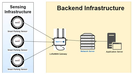 As discussed before, sensing infrastructure should be able to communicate over kilometers as smart parking solutions are intended to cover wide areas. In this sense, the usage of LPWAN protocols/technologies such as LoRaWAN which allows to communicate over long-range distances with low power consumption could be suitable. The proposed solution has used LoRaWAN because of its openness which allows to the developer to implement all the components of its architecture which is composed of end-devices, gateway, network server and application server (see Figure 3). As an additional information, it is important to indicate that the proposed architecture is based on the specification 1.0.2 of LoRaWAN. The components within the architecture perform specific tasks. For example, smart parking sensors are in charge of sensing vehicle presence and passing such data to the gateway over LoRaWAN network. The gateway transforms LoRa payloads into TCP/IP packets which are delivered to the network and application servers.