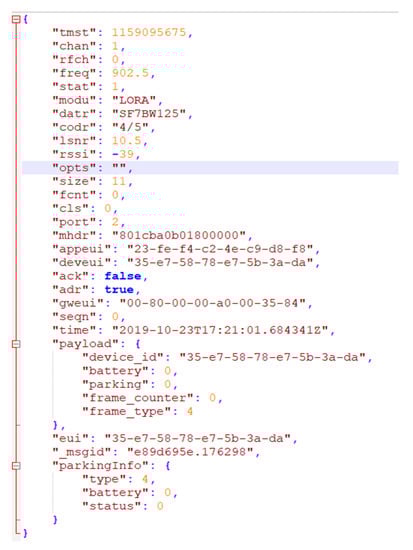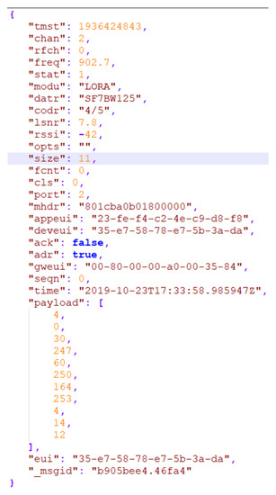 The main point of entry is the MQTT Server which is based on Mosquito (an open-source MQTT broker). The information forwarded by the Network Server is collected through this server via MQTT protocol. MQTT protocol delivers a lightweight method to handle messaging over a publisher/subscriber model [27]. The information received by Mosquito comes in Javascript Object Notation (JSON) format as shown in Figure 5 and Figure 6. Mosquito server forwards unencrypted payloads to a software component called “Raw Data Bridge”.