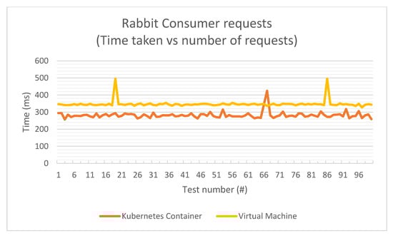 The following Figure 11 shows a comparative chart between the use of containers and virtual machines when deploying and RabbitMQ server. The chart shows one hundred tests and the time taken in collecting data sent from a sensor by a RabbitMQ consumer. The tests were performed by using a single sensor and one consumer, respectively. The orange line corresponds to the behavior of the RabbitMQ consumer over a container whilst the yellow line represents a consumer deployed over a virtual machine (VM). The average time taken to consume the information over a RabbitMQ container deployment borders 282 milliseconds whilst the average time of the same consumer over a VM borders 348 milliseconds which represents an increase of approximately 22%. This shows that the proposed approach in this paper is significantly better in terms of performance compared to a VM deployment. The architecture proposed helps to increase the performance of the solution.