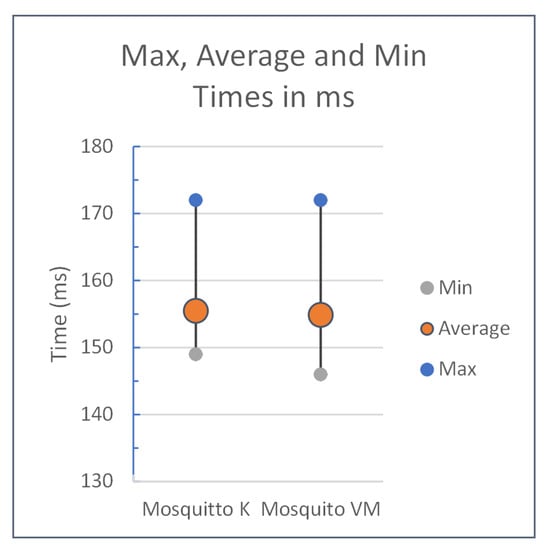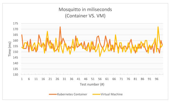 Mosquitto acted as a pass-through bridge which was able to deliver all generated payloads from different sensors through the same gateway. At this point, there was no need to perform additional development to support such feature. The following chart (see Figure 12) denotes the time taken in milliseconds by the Mosquitto component to process a set of requests. The Kubernetes deployment took an average of 156 ms to process a hundred request whilst the VM version took an average of 155 ms to process the same number of requests. In both scenarios, the maximum amount of time taken was 172 ms. However, the minimum amount of time taken by the Kubernetes deployment was 149 ms whilst the VM scenario tool 146 ms, this scenario took 3 ms less. In terms of general performance, Mosquitto behaved very similar in both scenarios showing that performance was not degraded because of the Kubernetes deployment making it a feasible component that could be deployed over the proposed architecture.