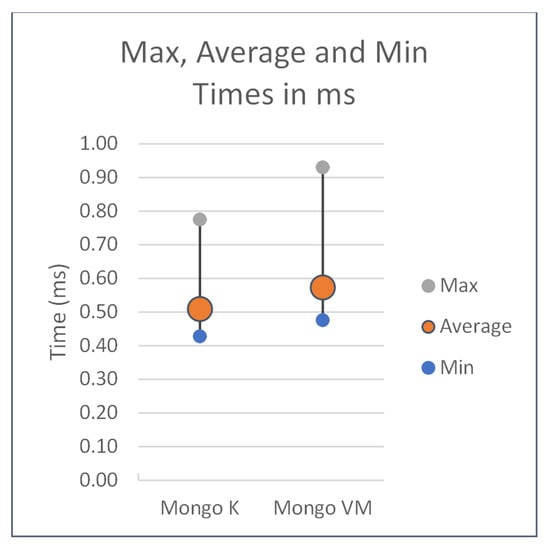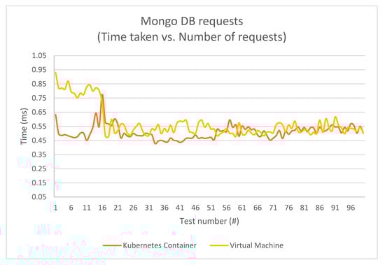 Several tests were performed to measure the performance impact over MongoDB when performing several requests against the database. The chart in Figure 13 shows the performance of MongoDB in both deployment scenarios. First of all, the orange line shows the behavior in a Kubernetes scenario where the average time to process a request was 0.51 ms, the maximum time was 0.78 ms and the minimum was 0.43 ms. On the other hand, regarding the VM deployment the average time showed 0.57 ms, the maximum was 0.93 and the minimum was 0.48 ms. With these results, it could be said that the Kubernetes deployment is 10.5% faster than the VM deployment. Thereby, this difference helps to ratify that the inclusion of this component in the architecture with the Kubernetes deployment scenario, improves the performance of the system.