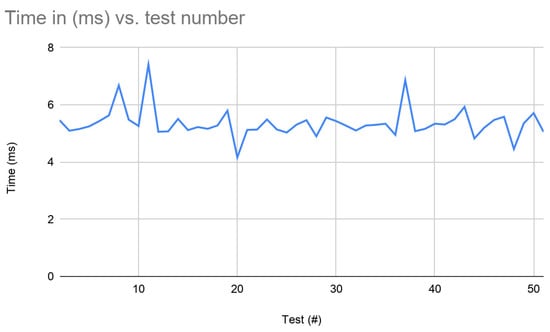 The following chart (see Figure 14) shows the time taken to process information generated by the sensor and written it into MongoDB repository. As shown, the inclusion of an MQTT server and a RabbitMQ server did not degrade the performance of the solution. According to the chart, the average time borders 5 milliseconds which is an appropriate time for real-time solutions. This chart is not considering the reporting time pre-configured in the sensor which has been established in 1 min by default; anyhow, every minute information would be processed and ready to be consumed in less than one second. These tests were performed with one sensor. The whole solution initially considers 10 sensors sensing and sending information every minute, if all sensors transmit at the same time, the maximum delay that the system would experiment would be about 1 s which is still a proper time for a real-time solution.