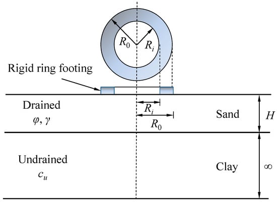 The description of the bearing capacity problem is shown in Figure 1. A rigid ring foundation, with internal radius (Ri) and external radius (R0), is placed on a sand layer that lies over a deep bed of clay. The sand layer, which has a thickness (H), a unit weight (γ), and an internal friction angle (φ), is drained. The undrained shear strength of the clay is given by cu. The ultimate bearing capacity of ring foundations on sand overlying clay can be described in the following dimensionless form: