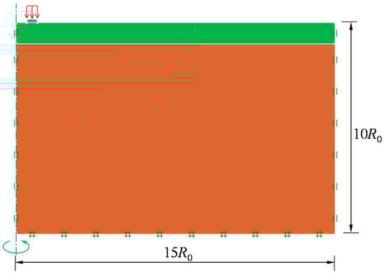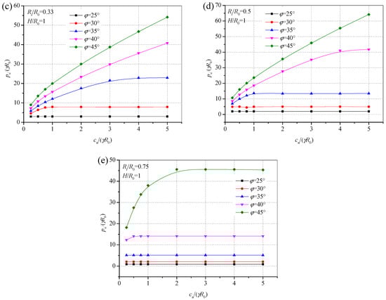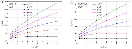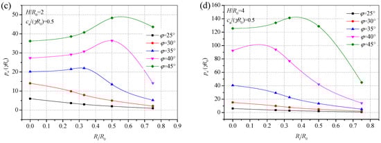 In this paper, five different values of the ratio Ri/R0, namely 0, 0.25, 0.33, 0.5, and 0.75, are taken into consideration, covering most problems of practical interest [,,]. The value of H/R0 varies from 0.25 to 4, corresponding to different values of cu/γR0, namely 0.25, 0.5, 0.75, 1, 2, 3, 4, and 5. The internal friction angle (φ) is set to 25°, 30°, 35°, 40°, and 45° [].
