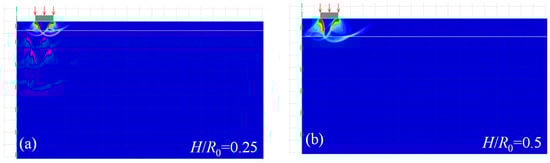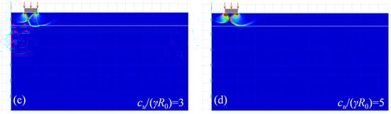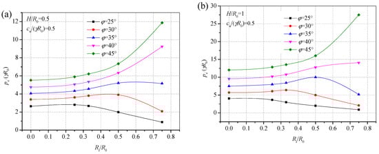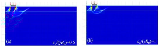 However, for the cases of φ = 35° with Ri/R0 ≤ 0.25 and φ = 40° to 45° with Ri/R0 ≤ 0.5, as the value of cu/(γR0) increases, the bearing capacity increases continuously, and the rate increase in bearing capacity decreases. It is implied that when the value of φ increases, the bearing capacity reaching a constant value needs a larger magnitude for cu/(γR0). This observation can be explained by the failure patterns for different values of φ, as presented in Figure 9, indicating that the failure mechanisms extend from the sand layer to the underlying clay when the value of φ increases. Thus, for the sand layer with larger values of φ, it requires a larger magnitude of cu/(γR0) to constrain the failure mechanisms within the sand layer, when the bearing capacity becomes independent of cu/(γR0). A similar tendency can also be observed in the work by Kumar and Chakraborty []. Interestingly, at a given value of H/R0 = 1, the shear strength of the clay has a negligible influence on the bearing capacity for smaller magnitudes of φ and larger values of Ri/R0. This may be attributed to fact that the value of Ri/R0 = 1 exceeds the critical depth (beyond which no further improvement occurs) of the sand layer, which is discussed later.