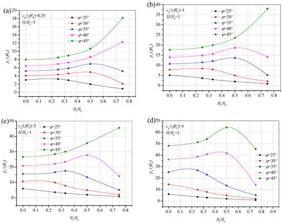 Variation in the normalized bearing capacity, p/(γR0), with Ri/R0 and φ for H/R0 = 1 with (a) cu/(γR0) = 0.25, (b) cu/(γR0) = 1, (c) cu/(γR0) = 2, and (d) cu/(γR0) = 5.