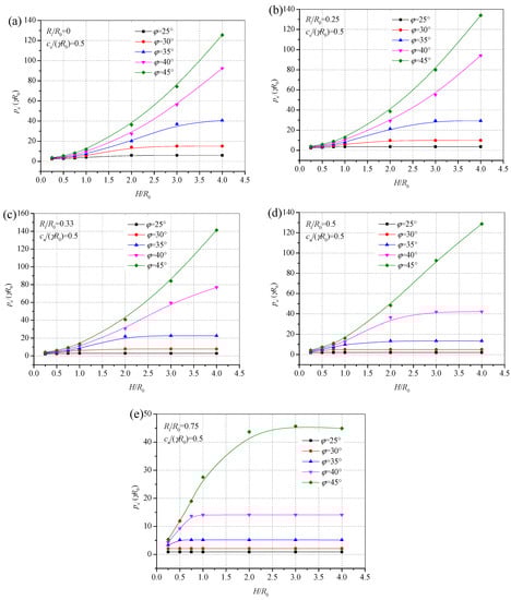 Variation in the normalized bearing capacity, p/(γR0), with H/R0 and φ for cu/(γR0) = 0.5 with (a) Ri/R0 = 0, (b) Ri/R0 = 0.25, (c) Ri/R0 = 0.33, (d) Ri/R0 = 0.5, and (e) Ri/R0 = 0.75.