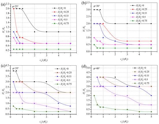 Variation in the critical thickness, H/R0, with cu/(γR0) and Ri/R0 for (a) φ = 25°, (b) φ = 30°, (c) φ = 35°, and (d) φ = 40°.