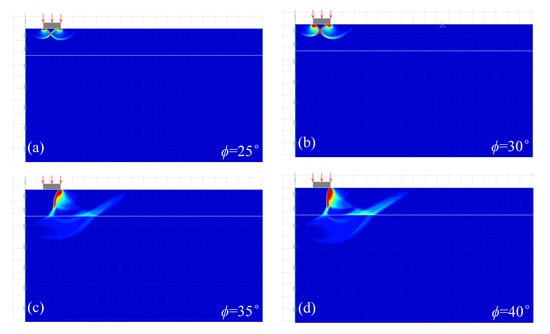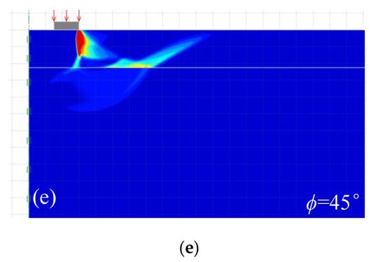 Figure 9 presents the variation in failure mechanisms with the variations in magnitudes for φ from 25° to 45°, with Ri/R0 = 0.5, cu/(γR0) = 1, and H/R0 = 0.75. For φ = 25° and 30°, the failure modes are developed only within the sand layer. On the other hand, for φ = 35°, 40°, and 45°, the slip lines of the sand block extend from the external edge of the ring footing to the upper surface of the clay layer, and the rupture lines develop from the clayey strata to the upper sand layer. It should be noted that the size of the plastic zone decreases as the value of φ decreases. Therefore, as the value of φ increases, the proportion of the collapse mechanism in the clay layer increases, giving rise to the possibility of punching shear failure [,].