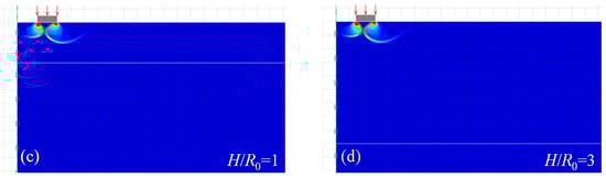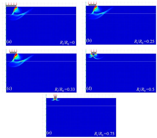 Figure 10 shows the failure mechanisms for different Ri/R0 with φ = 35°, cu/(γR0) = 2, and H/R0 = 0.75. For the cases of Ri/R0 = 0, 0.25, and 0.33, the failure modes are similar to Figure 9c–e. It needs to be mentioned that the failure surface in the sand layer inclines to the center line of the footing. From Figure 10d for Ri/R0 = 0.5 and Figure 10e for Ri/R0 = 0.75, it can be seen that the clayey stratum does not affect the collapse mechanisms. In addition, the size of the failure zone decreases with an increase in the value of Ri/R0, which also can be observed in Figure 10. Several failure modes for different H/R0 with φ = 35°, cu/(γR0) = 2, and Ri/R0 = 0.5 are illustrated in Figure 11. A critical thickness can be clearly seen. Interestingly, the failure mechanics for H/R0 = 1 and 3 are exactly the same. Therefore, it can be concluded that the collapse mechanics do not change when the thickness of the sand layer exceeds the critical depth.