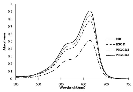 The absorption ability of the polymers was investigated with MB as a model molecule. The UV–vis spectra of MB exhibited a main absorption at 665 nm for the MB dimer and 612 nm for the MB monomer, as shown in Figure 5. Briefly, 50 mg of each polymer were added to 20 mL of MB (50 mg/L) overnight under stirring. The absorbance of the supernatant was measured after centrifugation. A decrease in the absorbance of the supernatant was observed for all the tested polymers (Figure 5), demonstrating that MB was effectively adsorbed by the polymers. However, the studied polymers did not demonstrate the same efficiency with regard to MB. The polymer based on PEDGE 500 (PEGCD1) was more efficient compared to EGCD and PEGCD2. This could be due to a better accessibility of the CD cavities and a rapid dissemination of MB through the polymer network.