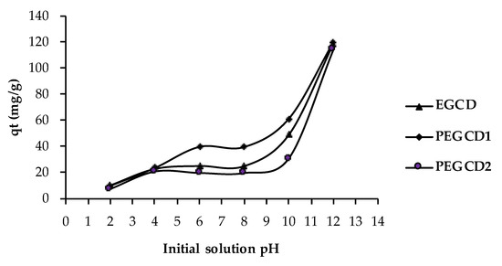 Effect of initial pH solution on the adsorption capacity of MB by EGCD, PEGCD1 and PEGCD2.