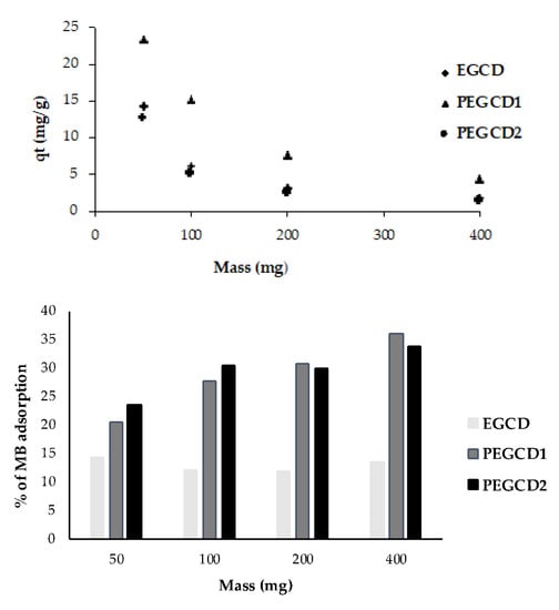 In order to estimate the required amount of solid polymer required to obtain a maximal adsorption, experiments were conducted by using 50 mL of MB (50 mg/L) with various polymer amounts (50 to 400 mg). The polymers were kept in contact with MB for 24 h at pH 6. The results displayed in Figure 7 demonstrate a loss of adsorption efficiency when increasing the mass of the polymers between 50 and 400 mg. The amount of adsorption sited should increase with the adsorbent mass and consequently exhaust the MB solution having a fixed concentration. In our case, the amount of MB decreases until 200 mg of polymer and tends to remain constant. Concerning the percentage of MB adsorbed, we can observe a slight increase for PEGCD1 and PEGCD2 from an initial amount of polymer of 50 mg to a ten times higher amount (400 mg). Concerning EGCD, whatever the amount, the polymer is able to be adsorbed around 15% of the initial MB present in the solution. It is therefore more useful to work with small masses of adsorbents from an economical point of view.