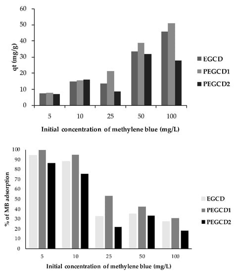 (Top) Effect of the initial concentration of MB on the adsorption capacity (mg/g) of MB by EGCD, PEGCD1 and PEGCD2; and (Bottom) effect of the initial concentration of MB on the percentage of MB adsorption.