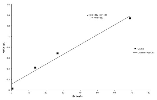 The linear regression line of Ce/Qe versus Ce allows to calculate the Langmuir constants KL and Qm. The separation factor RL was calculated through the following equation (Equation (4)).