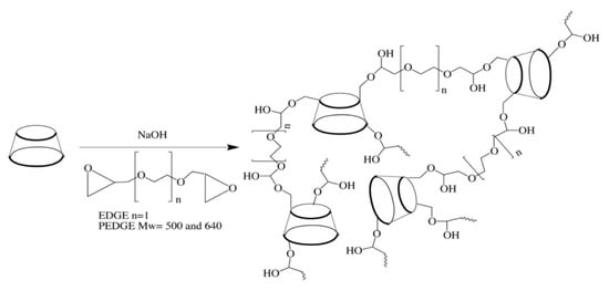 Few studies deal with the use of PEG as a crosslinker for the synthesis of β-CD polymers. These papers report that the conditions as well as the molecular weight (Mw) of the PEG affect the solubility of the obtained polymers, leading to soluble [] or insoluble polymers [,,,]. For example, Kono et al. [] described that bisphenol (BPA) was efficiently removed from an aqueous solution using β-CD polymers obtained with polyethylene glycol diglycidyl ether (PEDGE) as the crosslinking linker. This study has been corroborated by Lee []. By adding polyethylenimine in the polymer network, β-CD polymers based on PEDGE can readily remove BPA and copper from wastewater. Recently, the Dossi team has reported the synthesis of crosslinked β-CD polymers based on PEDGE and their nitrated derivatives for binder formulation with selected energetics [,,].