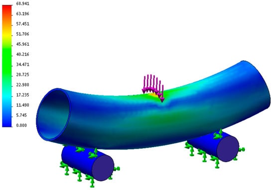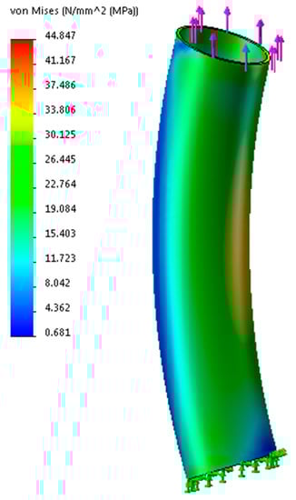 Pipe parts are mainly subjected to tensile and bending forces in practical applications. The finite element analysis method can be used to simulate these loading situations. Figure 1 shows the simulation of pipe parts subjected to tensile forces, and Figure 2 shows the simulation of pipe parts subjected to bending forces. Using conventional MEX processes, higher stresses concentrate in the inter-layer space, and thus, when the pipes are pulled, the printed parts are easily damaged, due to the small bonding force between the layers. Due to the influence of the staircase effect, when the pipe parts are under pressure, printed pipes are prone to stress concentration at the interlayer, which may easily cause failures. Therefore, printing along the axial direction of the pipes can avoid the above effects, thereby enhancing the mechanical properties of the printed pipe.