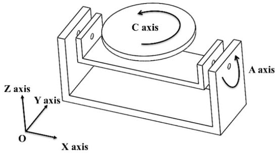 If the pipe parts are placed horizontally, the pipe parts can also be formed along the axial direction, adopting the traditional three-axis printing method. However, this method utilizes a lot of support material inside the pipe parts, inevitably resulting in material waste, difficult support removal and easy damage to the printed parts in the stripping process. To achieve both axial printing and unsupported printing, improving the freedom of the printing platform is one of the solutions. Therefore, this paper designs and develops a 5-axis MEX platform by adding the swing axis (A-axis) and the rotation axis (C-axis), based on the original X/Y/Z moving axis. The schematic diagram of the platform structure is shown in Figure 3.