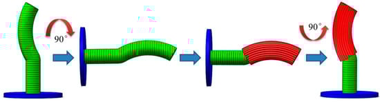 The printing process, adopting the 5-axis MEX platform, is shown in Figure 4. First, the layer-by-layer printing method is used to print a support pipe. Second, rotate A-axis of the platform by 90° so that the support is placed horizontally. Third, the printing nozzle prints the surface path along the axis of the pipe parts. After completing one single path, the C-axis rotates for a certain angle, the next path is printed, and so on, until the surface of the whole pipe part is entirely printed. The rotation angle of the C-axis is related to printing accuracy. Finally, rotate A-axis by 90° in the opposite direction to restore the initial position and remove the finalized pipe part.
