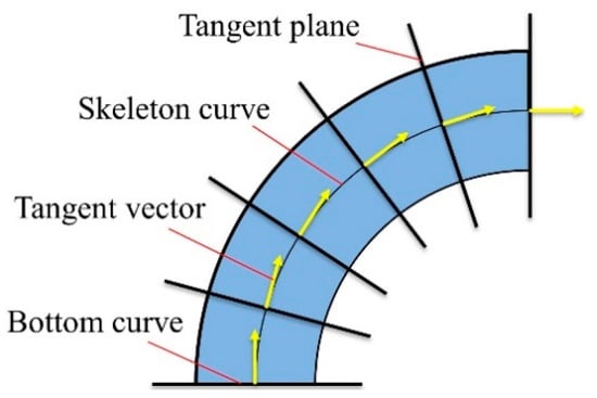 - Slice along the direction perpendicular to the tangent vector of the skeleton curve, to obtain the tangent plane of the model, as shown in Figure 6. The coordinate points on the tangent plane of the model are obtained by the skeleton curve equation and the bottom curve equation.