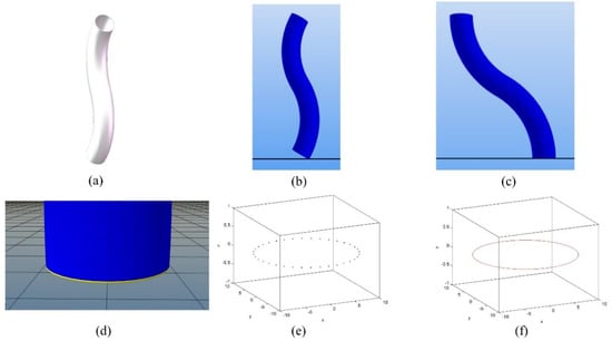 First, the target model is designed (Figure 7a), and the STL format file is obtained (Figure 7b). Secondly, the point cloud model file (Figure 7c) is extracted from the data of triangular surface in the STL file, and the skeleton point set of the model (Figure 7d) is extracted by the mean curvature flow (MCF) algorithm. Finally, the skeleton point set is fitted by the Bezier curve fitting method, to generate the skeleton curve (Figure 7e). The curve equation generated by fitting is as follows.