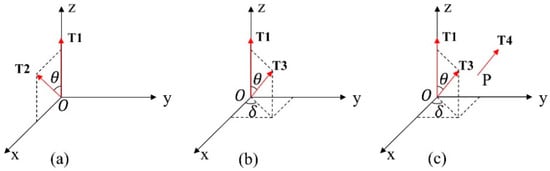 The transformation of the position between two shapes can be viewed as the transformation between vectors that are perpendicular to the shape. Figure 11 shows that the vector T1 parallel to the Z-axis can be converted into a vector T4 through the transformation of the coordinate system. First, rotate the vector T1 counterclockwise by around the Y-axis to obtain the vector T2. Next, rotate the vector T2 counterclockwise by around the Z-axis to obtain the vector T3. Finally, the vector T3 is moved from the origin O to the point P, to obtain the vector T4.