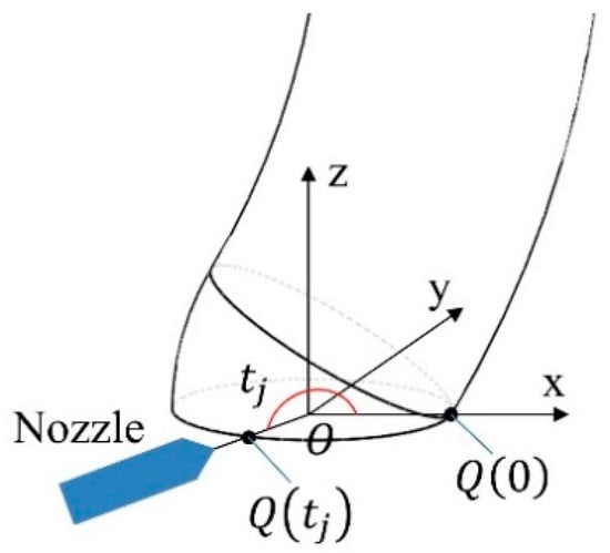 Through the transformation of the three-dimensional coordinate system, the coordinate points on any tangent plane are obtained. The direction of the nozzle corresponding to these coordinate points is parallel to the direction of , as shown in Figure 12. Where the point is the center point on the bottom curve, and the point is the coordinate point on the bottom curve. Simultaneously, the direction of the nozzle is not parallel to the direction of the Z-axis, so the direction of the current nozzle should be rotated to the direction parallel to the Z-axis.