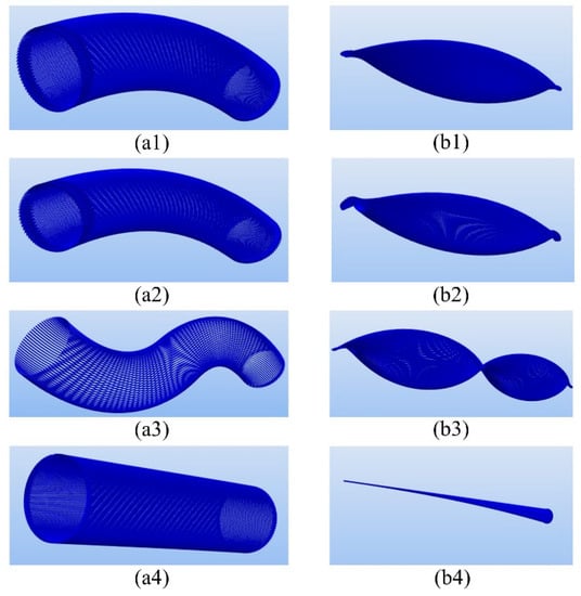 The first group of pictures (Figure 14(a1,b1)) represents the simulation results of the circular section shape of the pipe parts, and the skeleton curve of the plane single segment curve. The second group of pictures (Figure 14(a2,b2)) represents the simulation results of the pipe parts with an elliptic section, and a skeleton curve with a plane single segment curve. The third group of pictures (Figure 14(a3,b3)) represents the simulation results of the circular section shape of the pipe parts and the skeleton curve of the plane multi-segment curve. The fourth group of pictures (Figure 14(a4,b4)) represents the simulation results of the circular section shape of the pipe parts and the skeleton curve of the space curve.