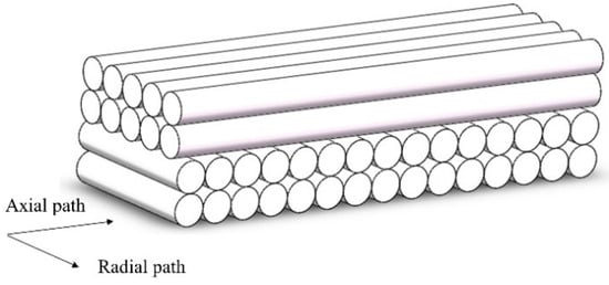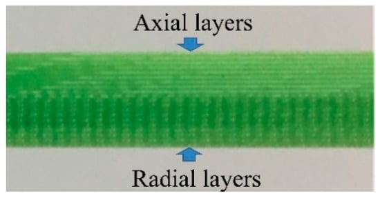 The thickness of the sample is 4 mm, and the thickness of the layer is 0.2 mm, which makes a total of 20 layers. To study the influence of axial printing on the mechanical properties of printed specimens, the number of layers printed along the radial path of the sample was determined according to the thickness of the actual supporting pipe, and the number of layers printed along the axial path of the sample was determined according to the thickness of the axial strengthening printing, as shown in Figure 18.