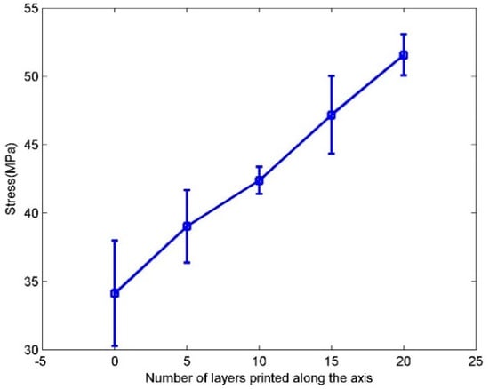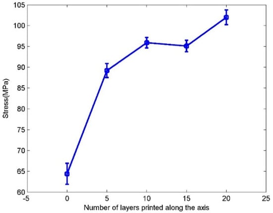 The data in Table 3 are represented by a graph, as shown in Figure 25. It can be seen from the experimental results that the strength of the printed pieces with 5 axial layers is 38.5% higher than that with 0 axial layers. However, as the number of axial layers continues to increase, the strength of the printed pieces does not increase significantly. Therefore, axial printing can reduce the impact of stress concentration on the printed piece, thus enhancing the mechanical properties of the printed samples.